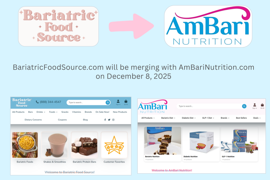 We're excited to announce that BariatricFoodSource.com and AmBariNutrition.com—both part of the same company—will officially consolidate into one site on Monday, December 8, 2025! This merger is simply a way to save on costs so we can continue to guarantee the lowest prices online, while providing access to the same high-quality products and our customer service team you've relied on for years.